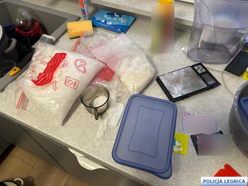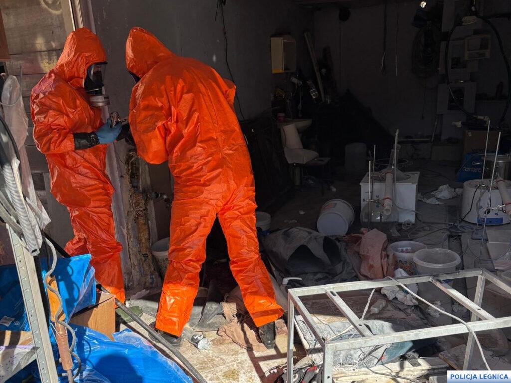 Podczas szczegółowych oględzin policjanci zabezpieczyli rozbudowany sprzęt laboratoryjny, w tym m.in. kolby szklane, naczynia żaroodporne, pipety, menzurki, strzykawki oraz liczne pojemniki z odczynnikami chemicznymi wykorzystywanymi do syntezy narkotyków. Równolegle prowadzone czynności procesowe w kolejnych lokalizacjach na terenie Legnicy oraz Lubina doprowadziły do ujawnienia następnych porcji narkotyków, sprzętu służącego do ich porcjowania, telefonów komórkowych, dokumentacji oraz gotówki mogącej pochodzić z przestępczej działalności.
